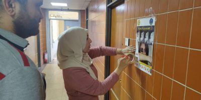 مركز التخطيط الحضري يعلق على جدرانه ملصقات تناهض العنف ضد المرأة.