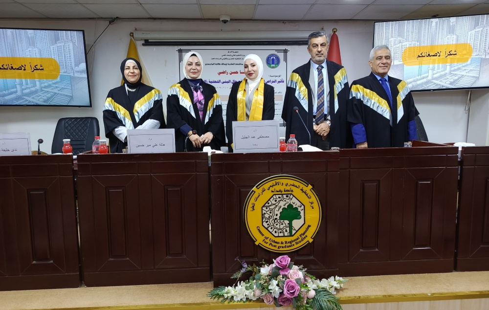 ناقش مركز التخطيط الحضري والإقليمي للدراسات العليا بجامعة بغداد رسالة الماجستير الموسومة ( تأثير التراص الحضري على واقع حال البنى التحتية ” الصرف الصحي” ) للطالبة سما حسن راضي، واشراف الاستاذ الدكتورة ندى خليفة ، هدفت الرسالة الى تحليل التحديات الراهنة وتقييم كفاءة خدمة الصرف الصحي في المجمعات السكنية بشارع مطار المثنى، مع التركيز على المؤشرات المرتبطة بالكثافة الحضرية واستدامة البنية التحتية.