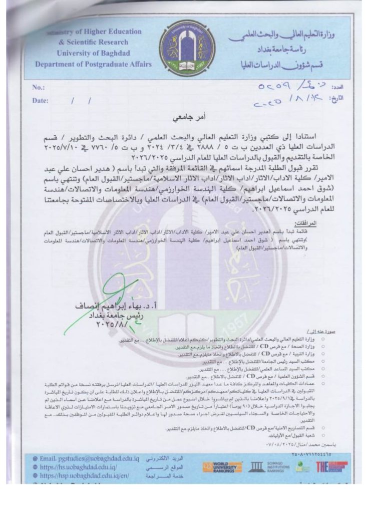 مركز التخطيط الحضري والاقليمي للدراسات العليا يعلن الامر الجامعي لاسماء المقبولين في الدبلوم العالي والماجستير للعام الدراسي 2025 – 2026 .