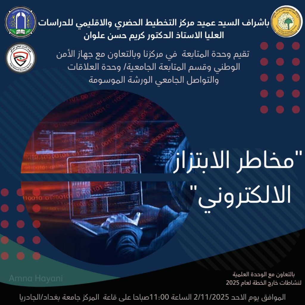 نظمت وحدة المتابعة الجامعية في مركز التخطيط الحضري والإقليمي للدراسات العليا بجامعة بغداد، ورشة بعنوان (مخاطر الابتزاز الإلكتروني)، بالتعاون مع جهاز الامن الوطني، فضلاً عن وحدة التواصل الجامعي في قسم المتابعة الجامعية، بحضور أساتذة المركز وموظفيه وطلبته.