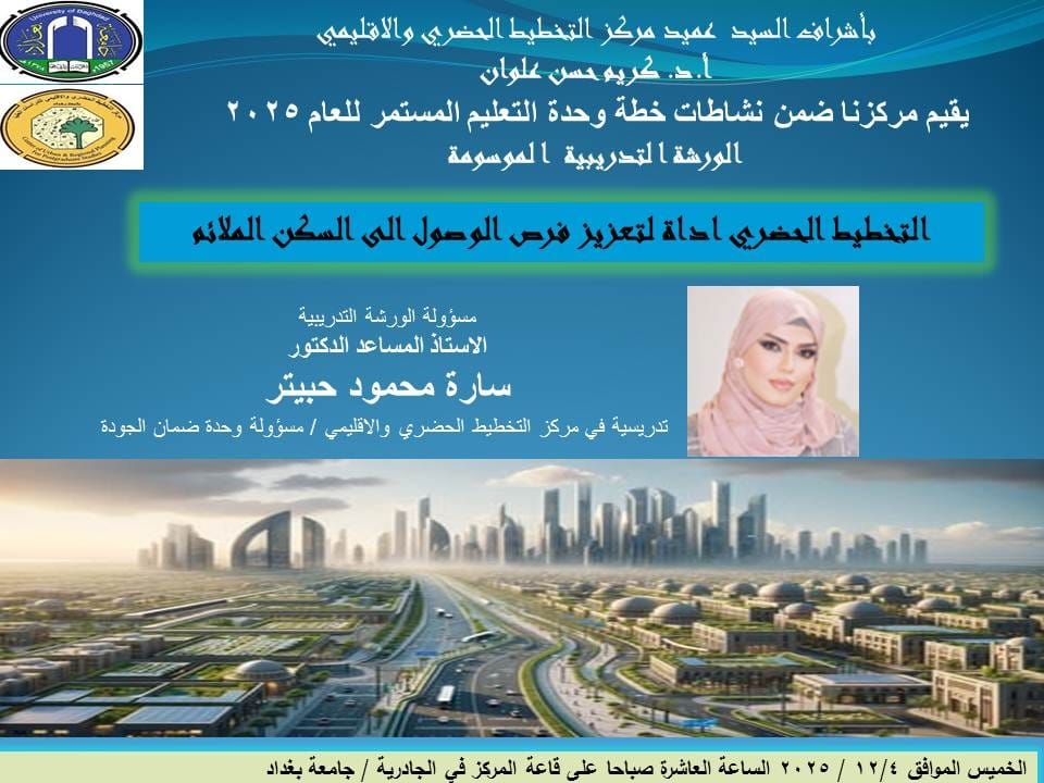 نظّم مركز التخطيط الحضري والإقليمي للدراسات العليا في جامعة بغداد، ورشة تدريبية متخصصة بعنوان ( التخطيط الحضري اداة لتعزيز فرص الوصول إلى السكن الملائم ) قدّمتها مسؤول وحدة ضمان الجودة في المركز الأستاذ المساعد الدكتورة سارة محمود وبحضور مجموعة من أساتذة وموظقي وطلبة المركز، فضلا عن عدد من المختصين في مجالات التخطيط الحضري والإسكان.